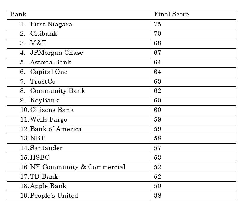 Just released, the New York Bank Ratings Index scores the nineteen largest banks by bank assets operating in New York State along 20 consumer-focused categories. The index then ranks the banks according to how well they perform under all of the categories combined, with a potential score of 100. More importantly, with a website that accompanies this index, consumers can customize the findings and create their own ranking, assigning different weights to the categories and focusing in on only those categories that matter the most to them.