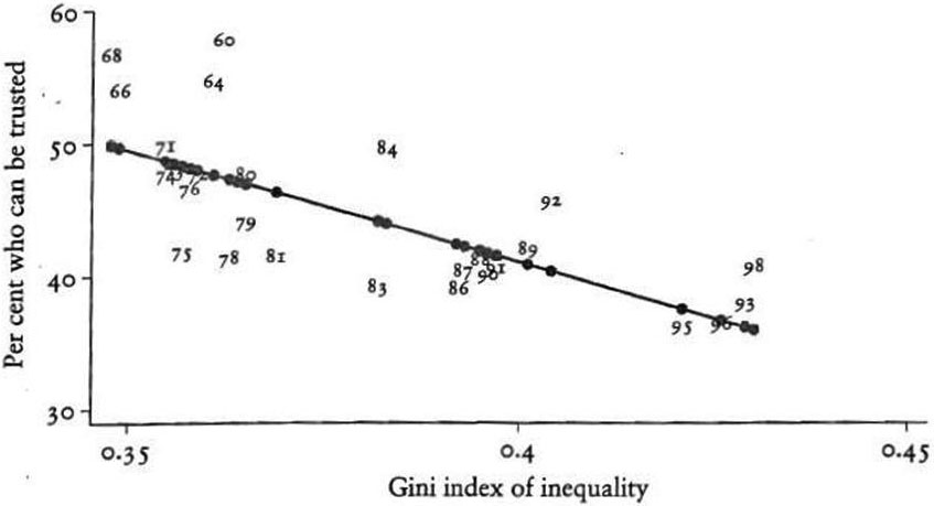 I explore these connections in greater depth here and here. Bottom line: inequality erodes trust because it increases social distance. An increase in social distance, in turn, tends to lead to more predatory conduct and rent seeking, exacerbating inequality.